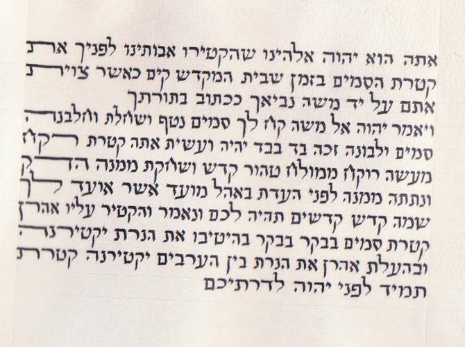 | Parachat Haketoret (prière qui décrit tout le rituel des offrandes de parfums au Temple. Celle-ci est une ségoula pour la réussite dans tous les domaines) |